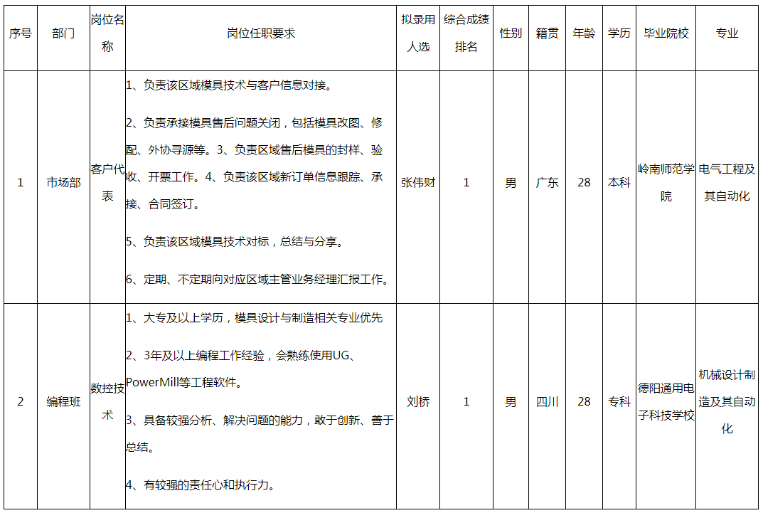 根據長虹模塑公司發(fā)布的招聘公告及招聘相關規(guī)定,經筆試、面試、考察、體檢等程序,擬錄用張偉財同志到客戶代表崗工作,劉橋同志到數(shù)控技術崗位工作,現(xiàn)予以公示,具體情況如下: