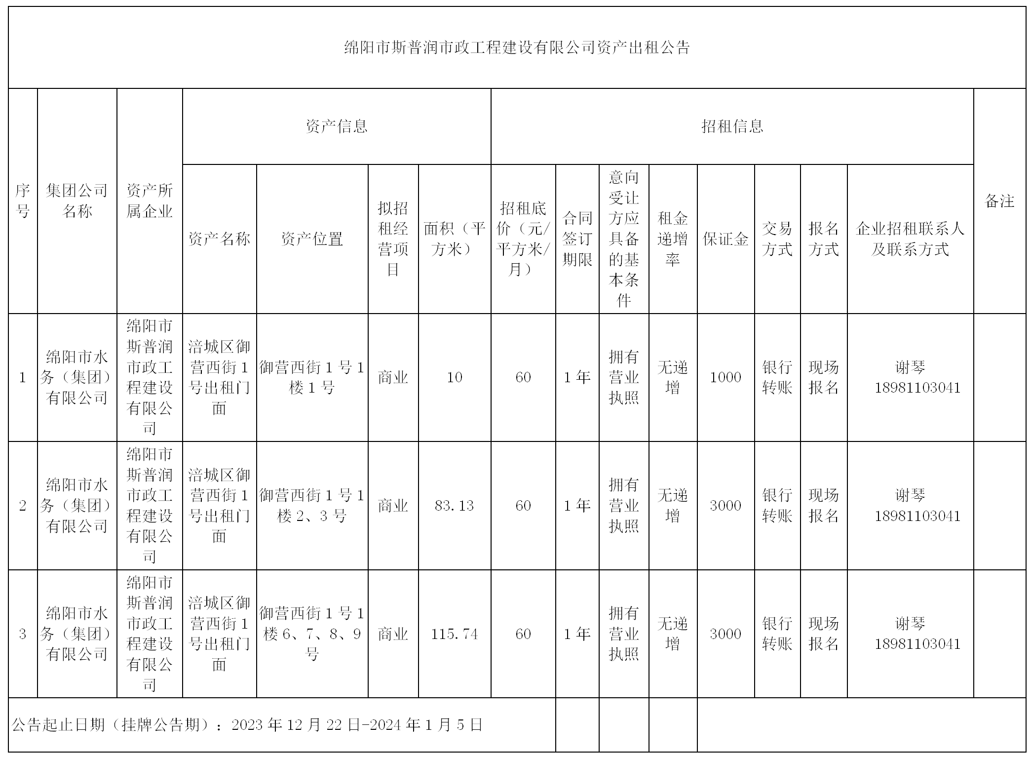 綿陽市斯普潤市政工程建設(shè)有限公司資產(chǎn)出租公告