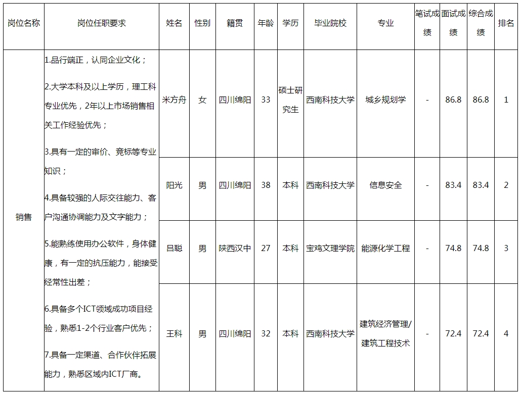 根據(jù)綿陽(yáng)市智慧城市產(chǎn)業(yè)發(fā)展有限責(zé)任公司發(fā)布的招聘公告及招聘相關(guān)規(guī)定,經(jīng)筆試、面試等程序,現(xiàn)將筆試(面試)成績(jī)予以公示。
