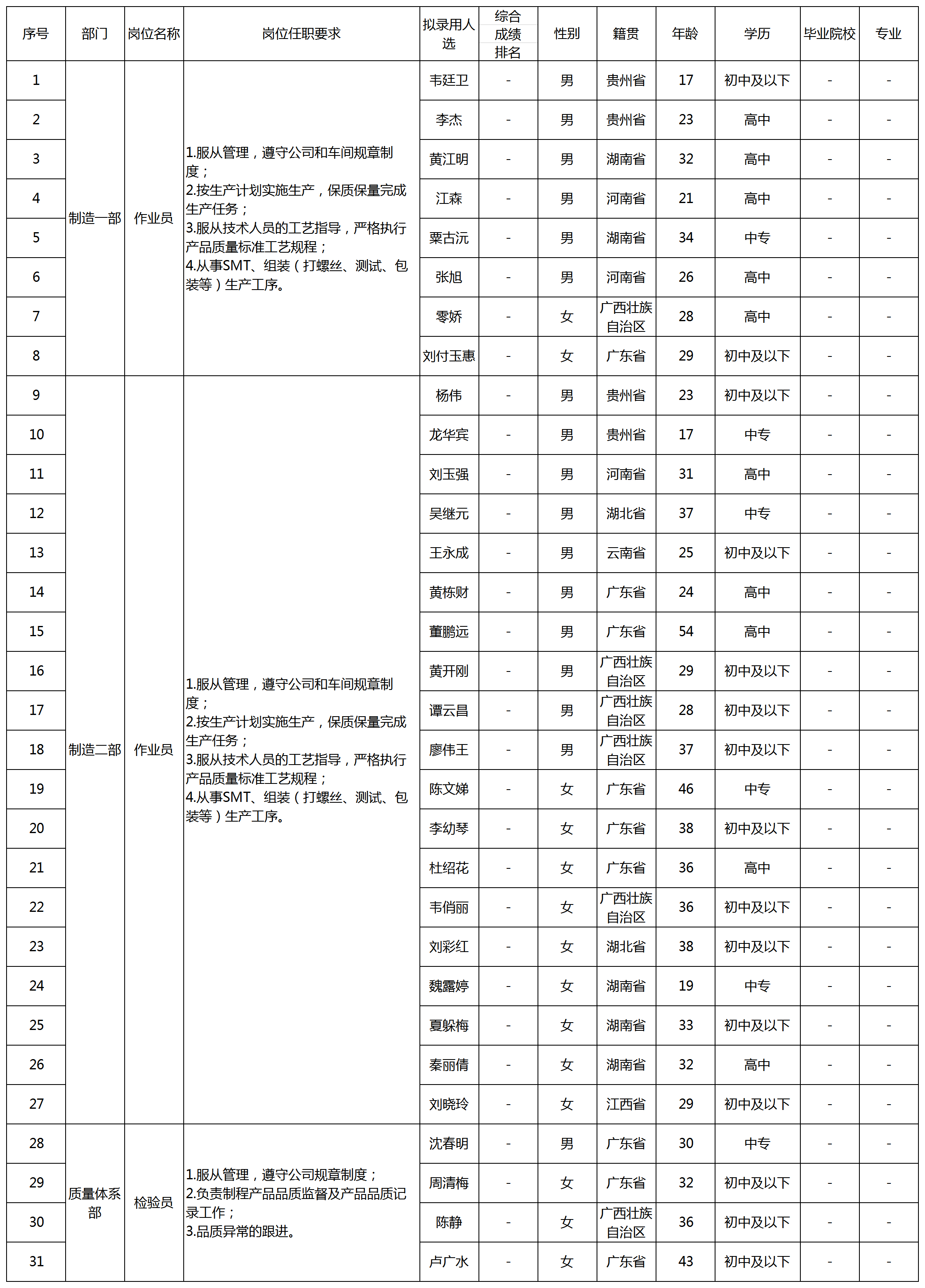 根據(jù)深圳市福瑞祥電器有限公司發(fā)布的招聘公告及招聘相關(guān)規(guī)定,經(jīng)筆試、面試、考察、體檢等程序,擬錄用韋廷衛(wèi)等31位同志到深圳市福瑞祥電器有限公司工作,現(xiàn)予以公示,具體情況如下: