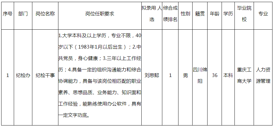 根據(jù)綿陽(yáng)人才集團(tuán)發(fā)布的招聘公告及招聘相關(guān)規(guī)定,經(jīng)筆試、面試、考察、體檢等程序,擬錄用劉思懿同志到綿陽(yáng)人才集團(tuán)工作,現(xiàn)予以公示,具體情況如下: