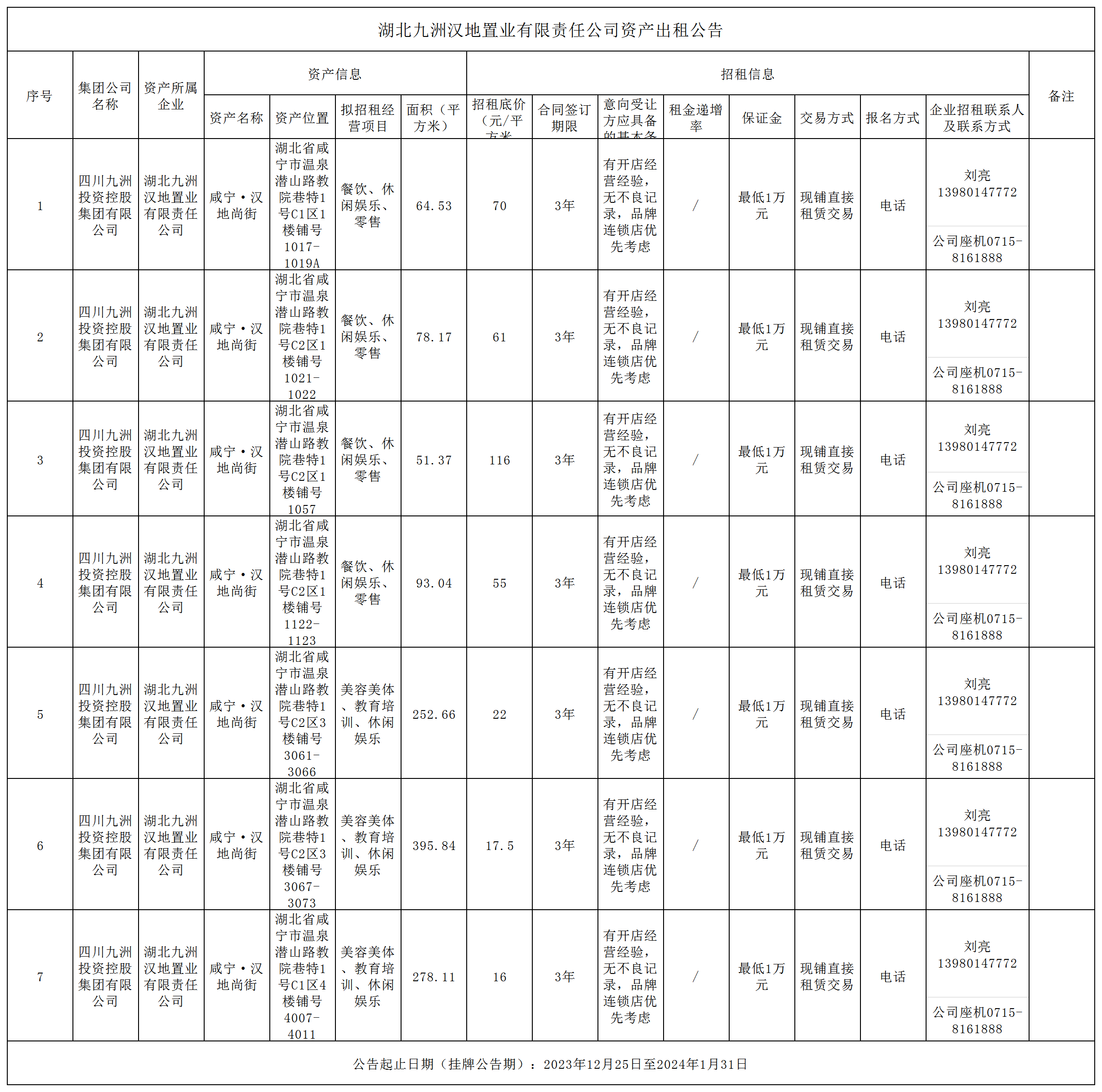 湖北九洲漢地置業(yè)有限責(zé)任公司資產(chǎn)出租公告