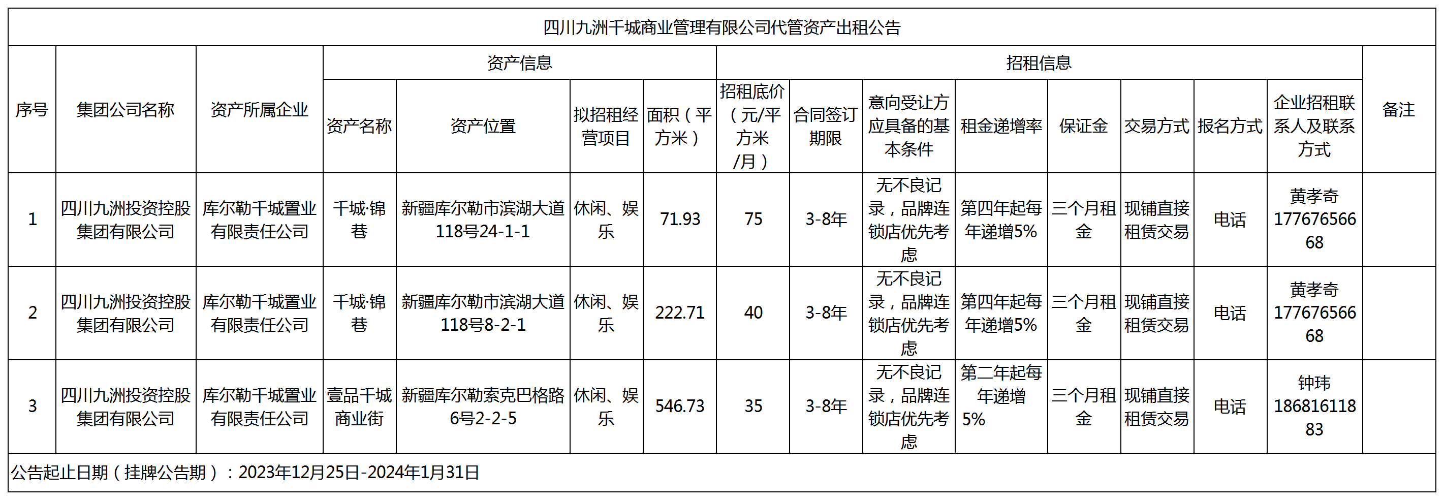 四川九洲千城商業(yè)管理有限公司代管資產(chǎn)出租公告