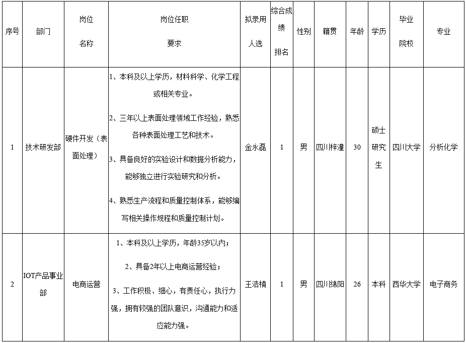 根據(jù)四川長虹電器股份有限公司(多媒體公司)發(fā)布的招聘公告及招聘相關(guān)規(guī)定,經(jīng)面試、考察、體檢等程序,擬錄用金永磊同志到技術(shù)研發(fā)部、王浩楠同志到IOT產(chǎn)品事業(yè)部工作,現(xiàn)予以公示,具體情況如下: