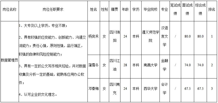 根據(jù)長(zhǎng)虹格潤(rùn)公司發(fā)布的招聘公告及招聘相關(guān)規(guī)定,經(jīng)面試程序,現(xiàn)將面試成績(jī)予以公示。