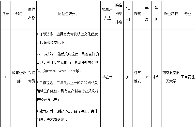 根據(jù)江蘇格潤(rùn)新材料有限公司發(fā)布的招聘公告及招聘相關(guān)規(guī)定,經(jīng)面試、考察、體檢等程序,擬錄用馬立偉同志到江蘇格潤(rùn)工作,現(xiàn)予以公示,具體情況如下:
