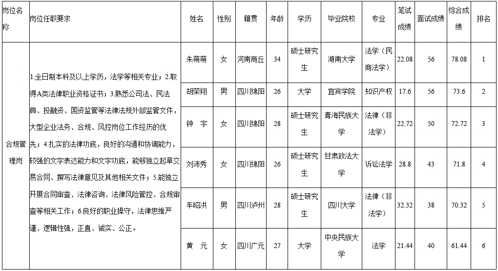 根據(jù)綿陽燃氣集團有限公司發(fā)布的招聘公告及招聘相關規(guī)定,經(jīng)筆試、面試等程序,現(xiàn)將綜合成績予以公示。