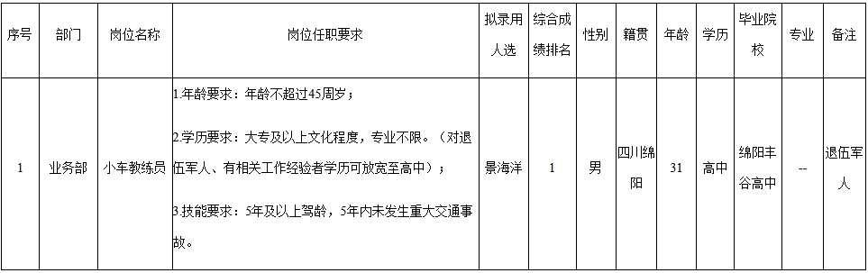 根據(jù)綿陽(yáng)市汽車實(shí)驗(yàn)駕駛技術(shù)學(xué)校股份有限公司發(fā)布的招聘公告及招聘相關(guān)規(guī)定,經(jīng)面試、實(shí)操、考察、體檢等程序,擬錄用景海洋同志到綿陽(yáng)市汽車實(shí)驗(yàn)駕駛技術(shù)學(xué)校股份有限公司工作,現(xiàn)予以公示,具體情況如下: