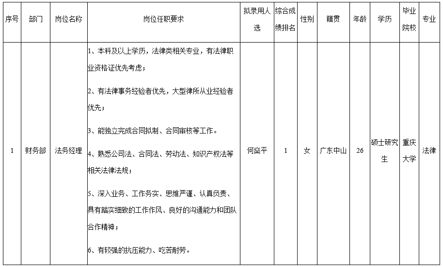 根據(jù)中山長虹電器有限公司發(fā)布的招聘公告及招聘相關規(guī)定,經(jīng)面試、考察、體檢等程序,擬錄用何燊平同志到法務經(jīng)理工作,現(xiàn)予以公示,具體情況如下: