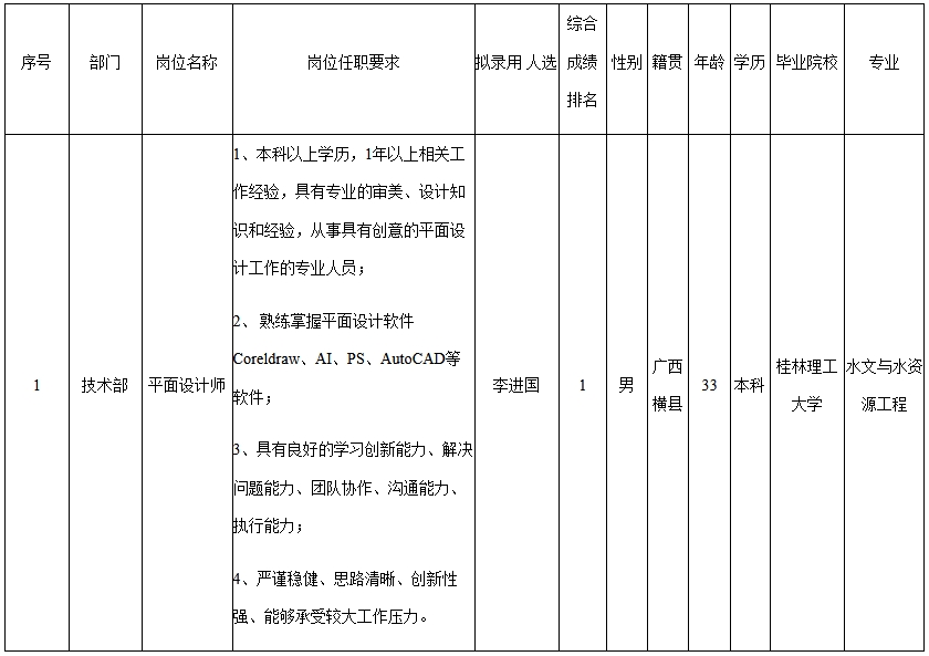 根據(jù)中山長虹電器有限公司發(fā)布的招聘公告及招聘相關規(guī)定,經(jīng)面試、考察、體檢等程序,擬錄用李進國同志到平面設計師工作,現(xiàn)予以公示,具體情況如下: