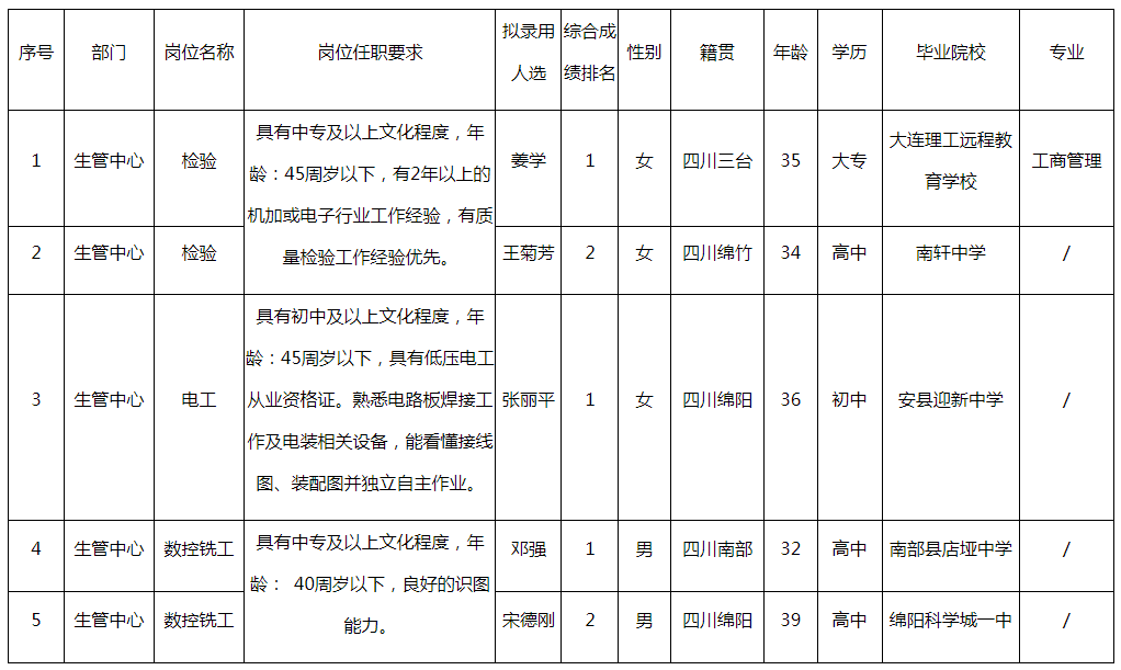 根據(jù)四川長虹智能制造技術有限公司發(fā)布的招聘公告及招聘相關規(guī)定,經面試、考察、體檢等程序,擬錄用姜學、王菊芳、張麗平、鄧強、宋德剛同志到四川長虹智能制造技術有限公司工作,現(xiàn)予以公示,具體情況如下: