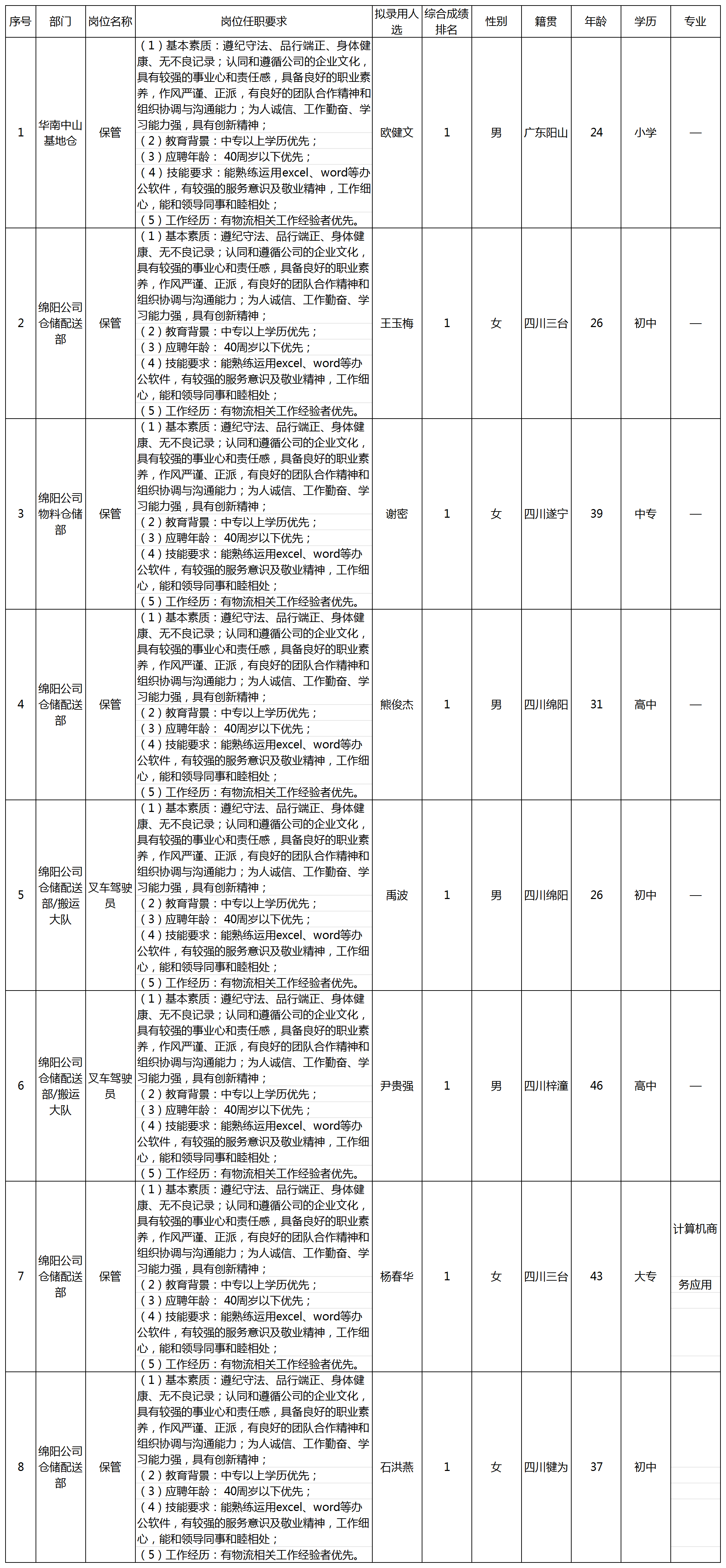 根據(jù)四川長(zhǎng)虹民生物流股份有限公司發(fā)布的招聘公告及招聘相關(guān)規(guī)定,經(jīng)筆試、面試、考察、體檢等程序,擬錄用歐健文等8名同志到四川長(zhǎng)虹民生物流股份有限公司工作,現(xiàn)予以公示,具體情況如下:
