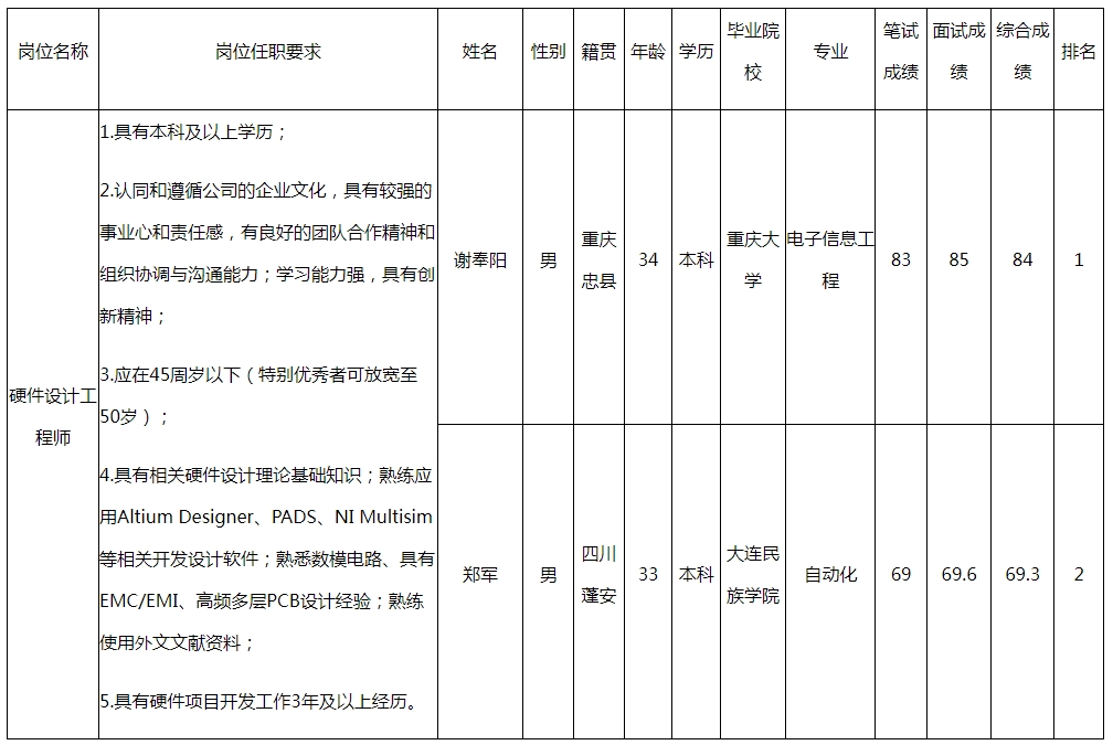 根據(jù)重慶九洲隆瓴科技有限公司發(fā)布的招聘公告及招聘相關(guān)規(guī)定,經(jīng)筆試、面試等程序,現(xiàn)將筆試(面試)成績(jī)予以公示。