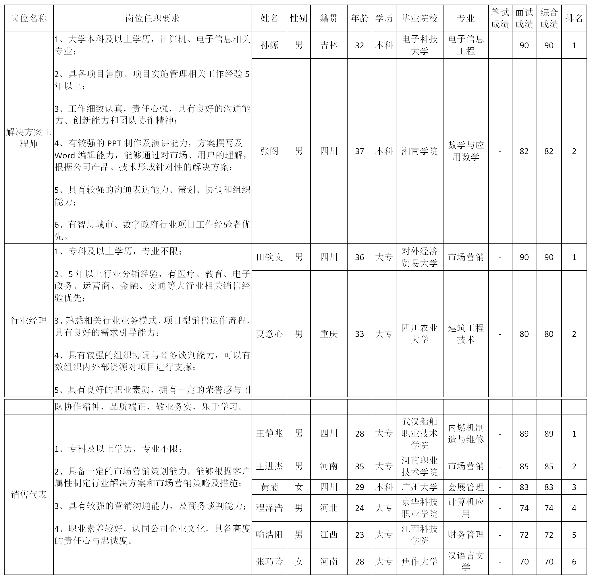 根據(jù)四川科瑞軟件有限責(zé)任公司發(fā)布的招聘公告及招聘相關(guān)規(guī)定,經(jīng)筆試、面試等程序,現(xiàn)將筆試(面試)成績(jī)予以公示。