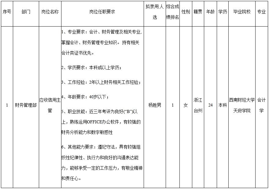 根據(jù)四川愛創(chuàng)科技有限公司發(fā)布的招聘公告及招聘相關(guān)規(guī)定,經(jīng)面試、考察、體檢等程序,擬錄用楊勝男同志到財(cái)務(wù)管理部工作,現(xiàn)予以公示,具體情況如下: