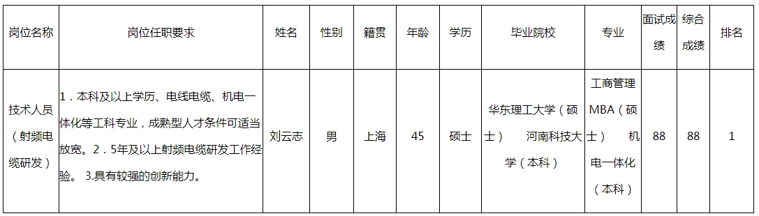 根據(jù)四川九洲線纜有限責(zé)任公司發(fā)布的招聘公告及招聘相關(guān)規(guī)定,經(jīng)面試程序,現(xiàn)將面試成績予以公示。