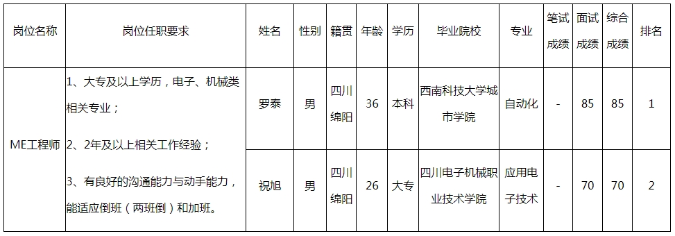 根據(jù)四川九州電子科技股份有限公司發(fā)布的招聘公告及招聘相關規(guī)定,經(jīng)筆試、面試等程序,現(xiàn)將筆試(面試)成績予以公示。