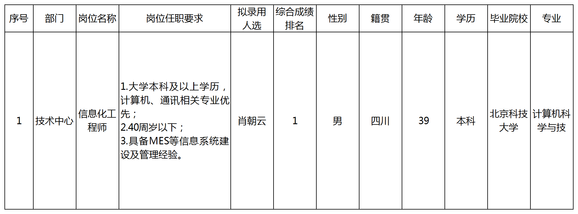 根據(jù)宜賓紅星電子有限公司發(fā)布的招聘公告及招聘相關(guān)規(guī)定,經(jīng)面試、體檢程序,擬錄用肖朝云同志到宜賓紅星電子有限公司工作,現(xiàn)予以公示,具體情況如下: