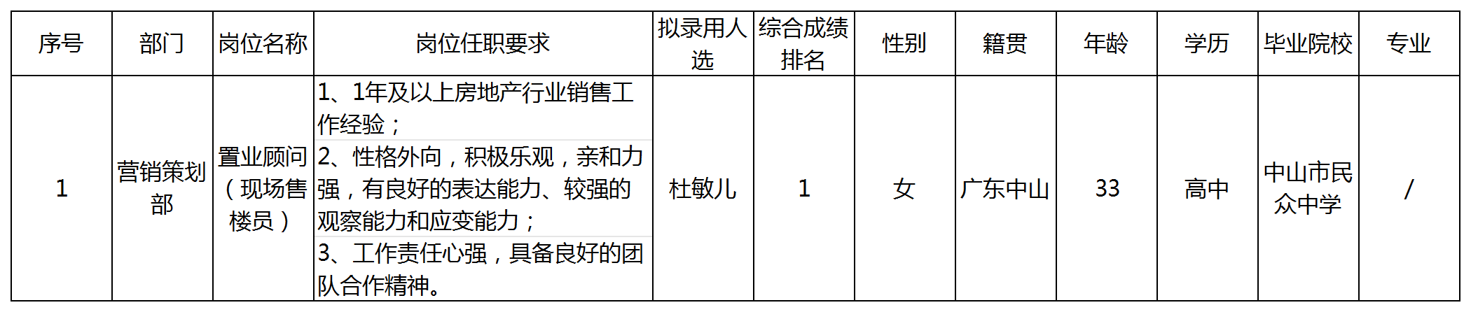 根據(jù)四川長(zhǎng)虹置業(yè)有限公司發(fā)布的招聘公告及招聘相關(guān)規(guī)定,經(jīng)面試、考察、體檢等程序,擬錄用杜敏兒同志到四川長(zhǎng)虹置業(yè)有限公司工作,現(xiàn)予以公示,具體情況如下: