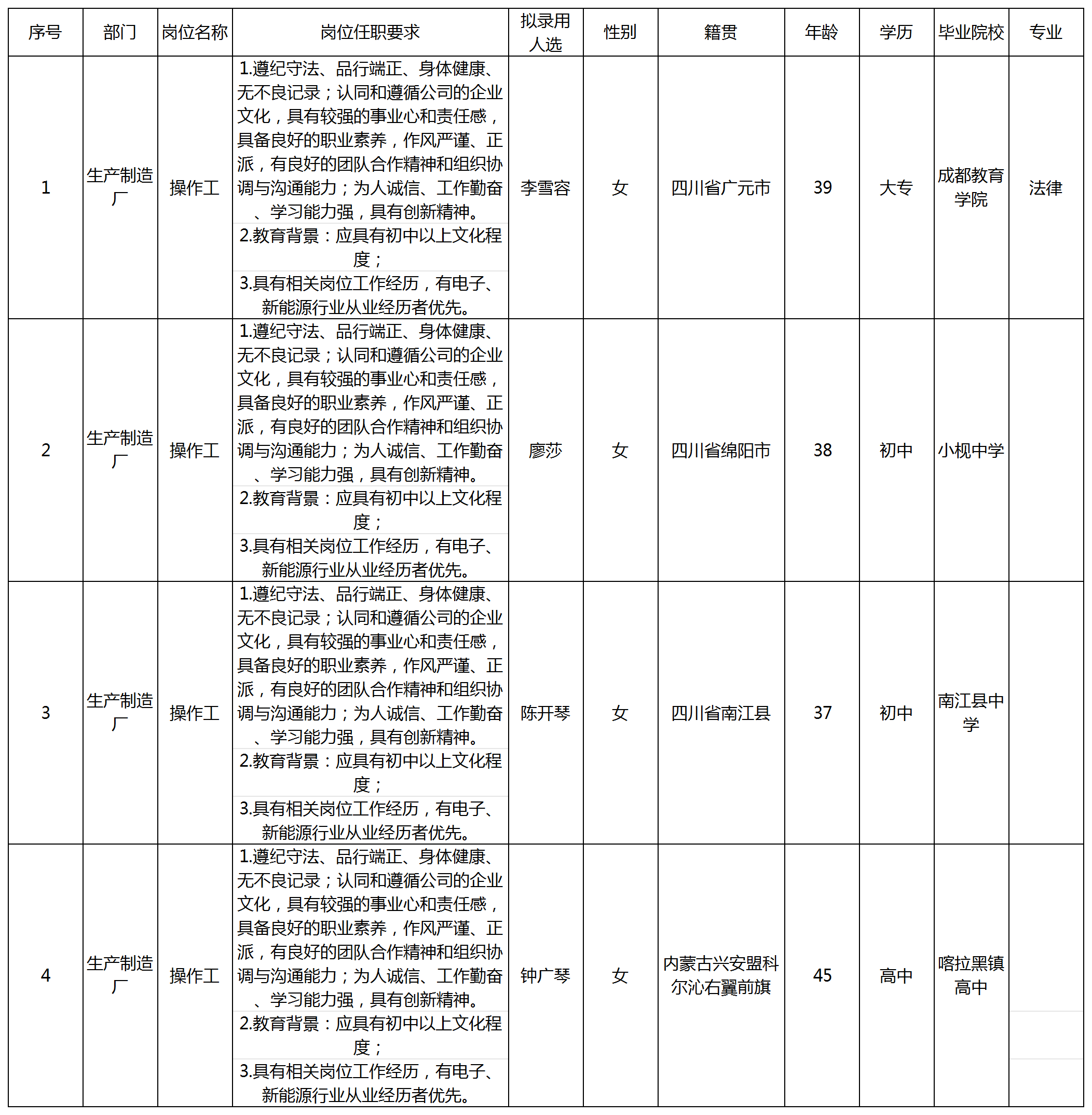 根據(jù)四川能創(chuàng)智電科技有限責(zé)任公司發(fā)布的招聘公告及招聘相關(guān)規(guī)定,經(jīng)面試、考察、體檢等程序,擬錄用李雪容等4位同志到四川能創(chuàng)智電科技有限責(zé)任公司工作,現(xiàn)予以公示,具體情況如下: