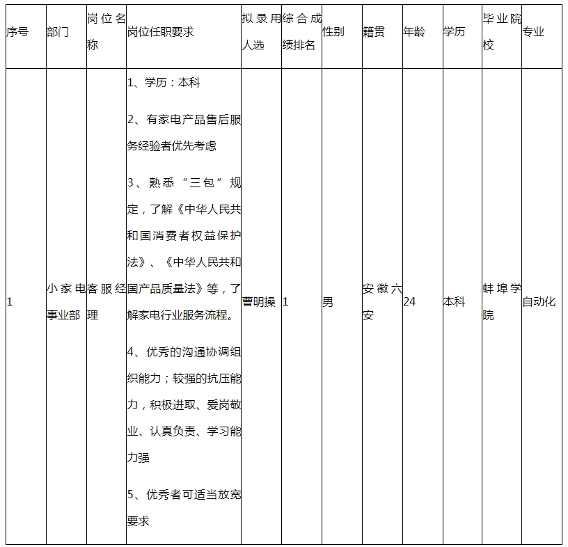 根據(jù)公司經(jīng)營(yíng)管理需要,小家電事業(yè)部招聘客服經(jīng)理崗位1人,經(jīng)簡(jiǎn)歷篩選、面試、體檢等程序,曹明操滿足錄用條件,現(xiàn)予以公示。