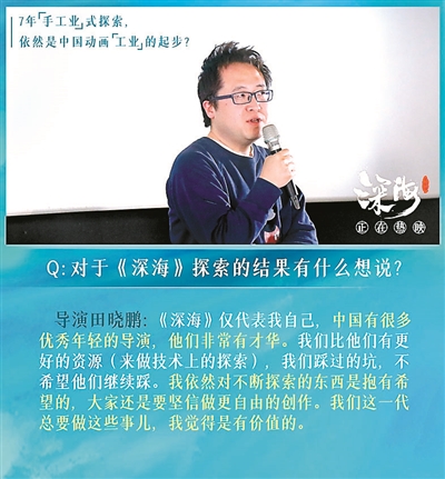 《大圣歸來》豆瓣8.3分,《深?!?.3分,一分之差,讓田曉鵬聽到了不少批評的聲音,對此田曉鵬坦承《深?!肥撬淮蚊半U,這是他一次非常個人化的創(chuàng)作,“我愿意承擔這次冒險的代價”。