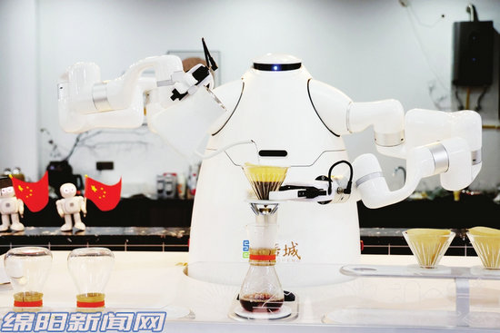 2月5日,綿陽市涪城區(qū)創(chuàng)青年·1952項(xiàng)目生產(chǎn)的機(jī)器人,磨出新年的第一杯咖啡。(綿報融媒記者 陳冬冬 攝)