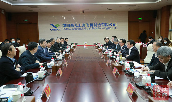 在中國商飛公司期間,曹立軍考察了企業(yè)5G創(chuàng)新中心、智能生產(chǎn)線、總裝生產(chǎn)線,詳細(xì)了解企業(yè)發(fā)展歷程、科技研發(fā)、智能制造等情況,并實(shí)地參觀了ARJ21、C919展示樣機(jī)。此次雙方還圍繞政企合作、產(chǎn)品研發(fā)、產(chǎn)品采購等方面簽訂合作協(xié)議和備忘錄。