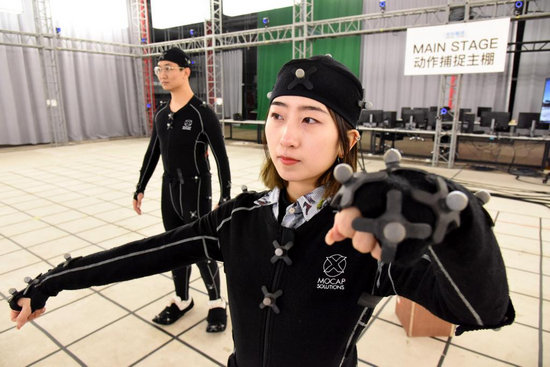 2月8日,青島東方影都影視產(chǎn)業(yè)園工作人員在演示動作捕捉技術(shù)。