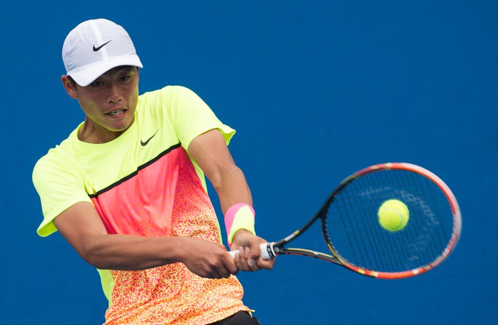 2015年1月25日,吳易昺在2015年澳大利亞網(wǎng)球公開賽青少年男單比賽中回球。新華社發(fā)(白雪攝)
