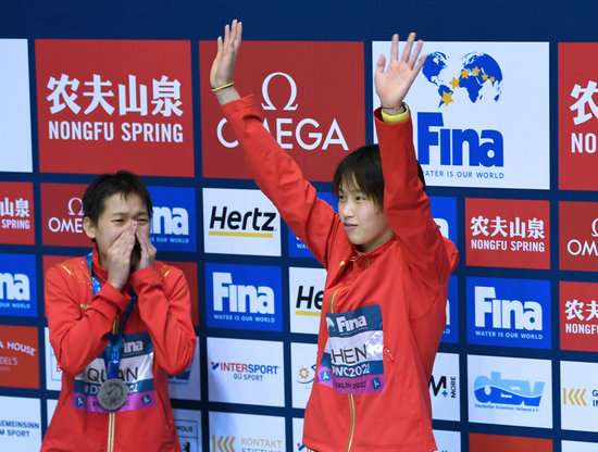 2022年10月22日,冠軍陳芋汐(右)和亞軍全紅嬋在2022年跳水世界杯女子10米跳臺(tái)決賽后。新華社記者任鵬飛攝