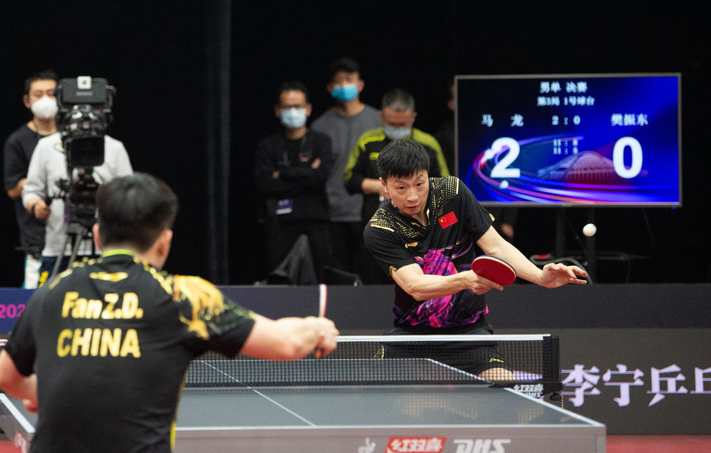 2月23日,馬龍(右)和樊振東在世乒賽選拔賽男單決賽中。新華社記者 陳鐘昊 攝