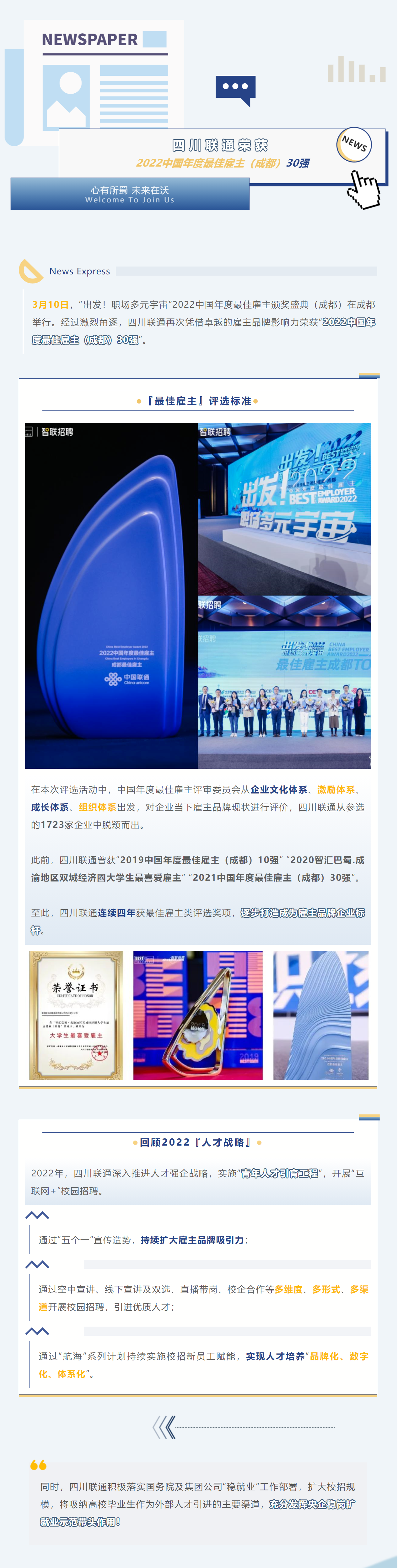 四川聯(lián)通榮獲"2022中國年度最佳雇主(成都)30強"