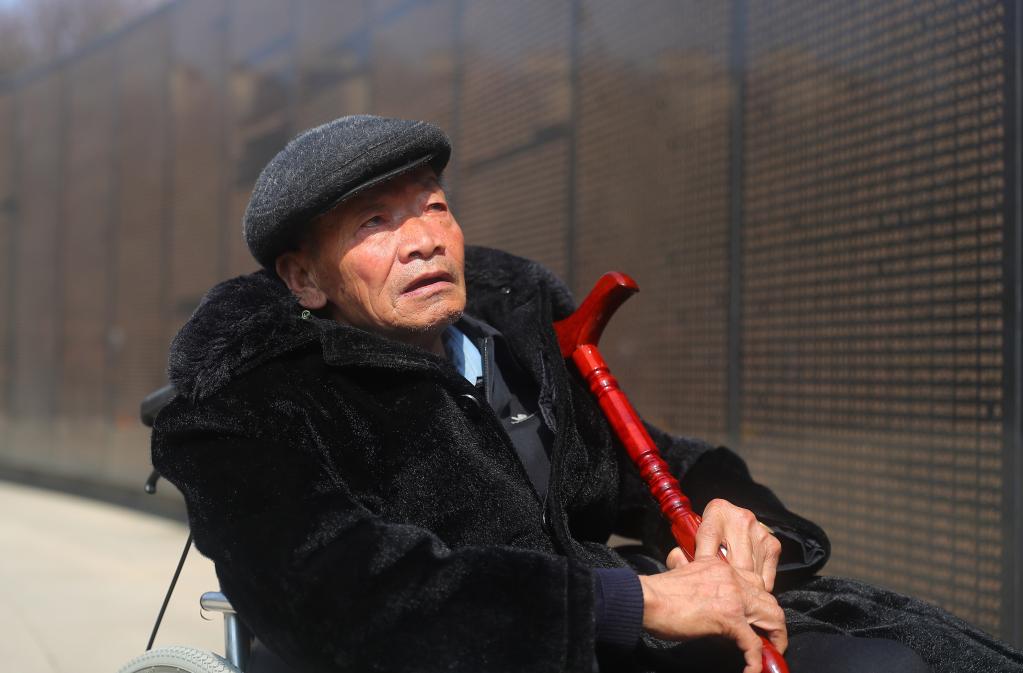 陳壽玉推著輪椅上76歲的父親陳六街,沿著沈陽抗美援朝烈士陵園內(nèi)的環(huán)形烈士英名墻一點(diǎn)點(diǎn)尋找。清明節(jié)前夕,父子倆從貴州省銅仁市沿河縣的老家跋涉千里來到沈陽,只為找尋烈士英名墻上“陳福平”三個(gè)字,看一眼那闊別已久的親人。