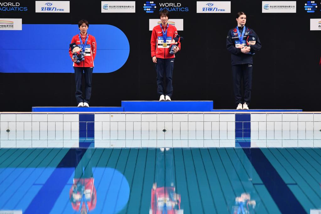 4月16日,冠軍中國選手陳芋汐(中)、亞軍中國選手全紅嬋(左)與季軍英國選手西里埃在頒獎儀式上。新華社記者 張博文 攝