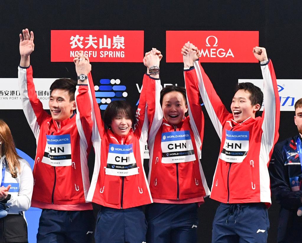 4月16日,中國隊選手楊昊、陳芋汐、陳藝文、王宗源(從左至右)在頒獎儀式上。新華社記者 張博文 攝
