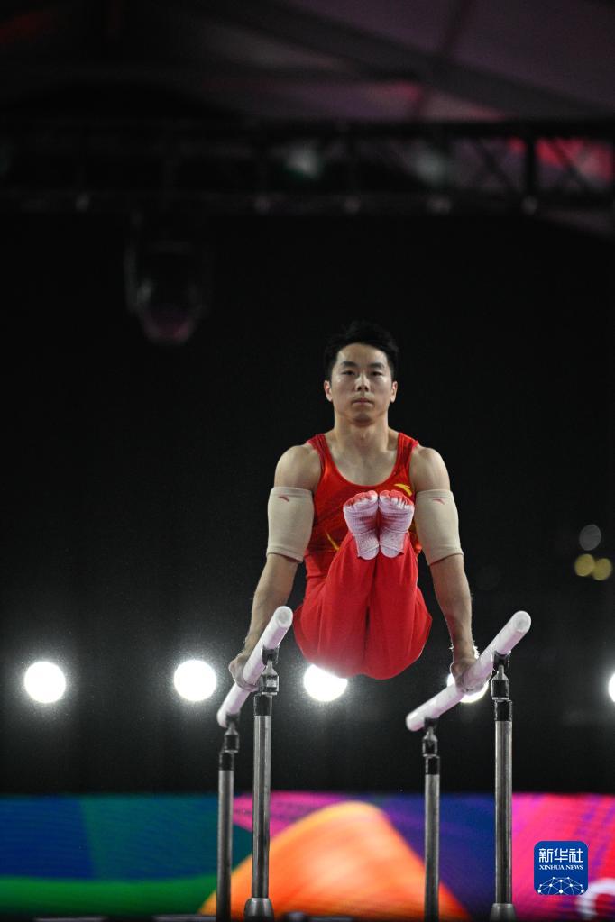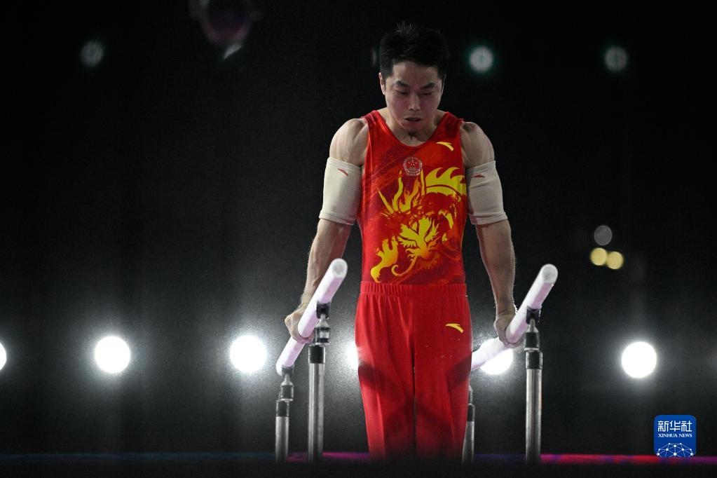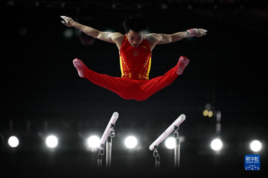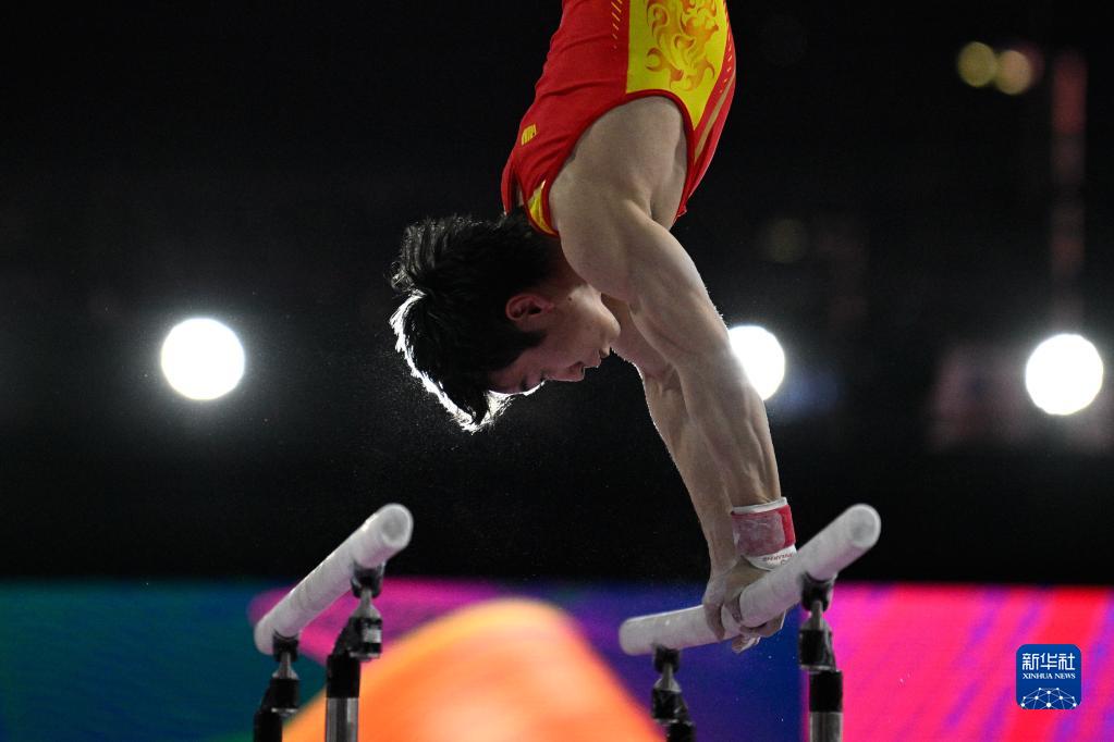4月16日,四川隊選手鄒敬園在雙杠比賽中,最終他位列第一名。新華社記者 胥冰潔 攝
