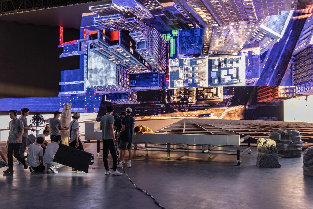5月5日,在中國影視科技創(chuàng)新成果展上,參展企業(yè)展示LED虛擬拍攝系統。