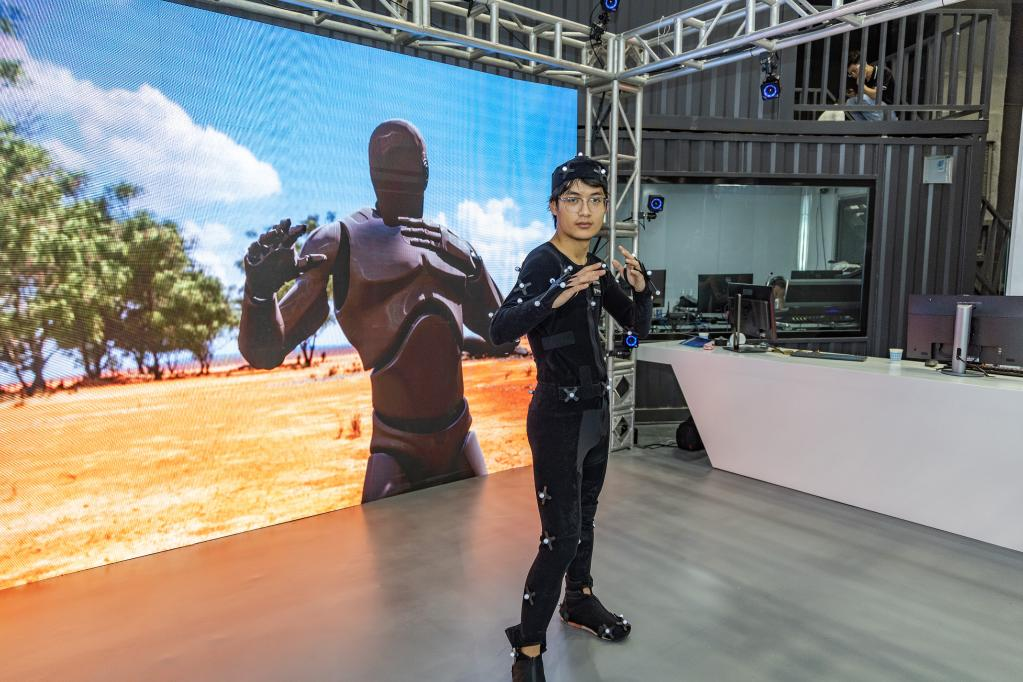 5月5日,在中國影視科技創(chuàng)新成果展上,參展企業(yè)展示光學動捕技術。