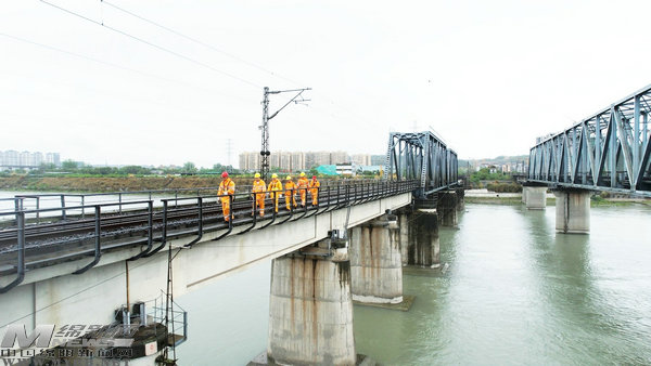 鐵路工人在涪江大橋關(guān)鍵設(shè)備進(jìn)行巡查