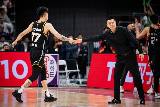 5月10日,遼寧隊(duì)主教練楊鳴(右)在比賽暫停間隙與隊(duì)員張鎮(zhèn)麟擊掌。新華社記者 江漢 攝