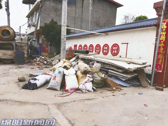 在立新鎮(zhèn)場(chǎng)鎮(zhèn)入口處的王家村公交車(chē)招呼站牌下,一字排開(kāi)的建筑垃圾堆了一長(zhǎng)排,站牌對(duì)面的一處電桿下堆放了一大堆生活垃圾,無(wú)人清理,而僅僅距離該處100米左右便立有一塊宣傳牌:“國(guó)家衛(wèi)生鎮(zhèn)立新鎮(zhèn)”。轉(zhuǎn)入左邊道路就是立新派出所,門(mén)前的花臺(tái)長(zhǎng)期無(wú)人清理,各種垃圾雜陳期間。再往前進(jìn)入場(chǎng)鎮(zhèn),一片荒草叢中,也是碎小垃圾遍布,顯然是長(zhǎng)期無(wú)人清理的狀態(tài)。