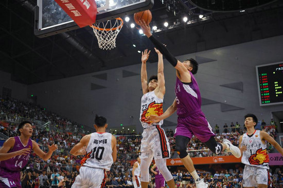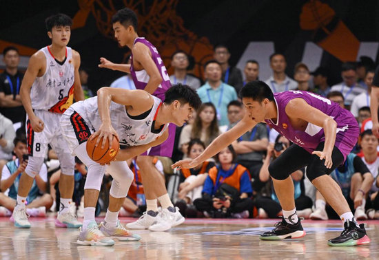 6月18日,廣東工業(yè)大學(xué)隊球員陳國豪(右三)在比賽中防守清華大學(xué)隊球員鄒陽(右二)。新華社記者 胥冰潔 攝