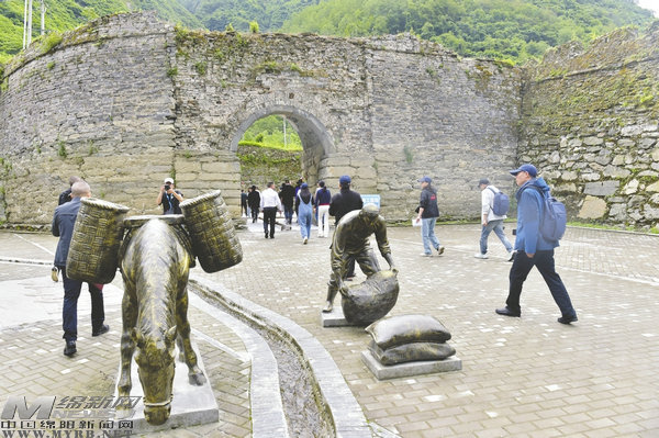 從松潘縣黃龍出發(fā),行駛約90分鐘后進(jìn)入小河鎮(zhèn)豐河村,一段古樸的石頭城墻出現(xiàn)在眼前,這里就是涪陽古鎮(zhèn)所在。古老的石板鋪設(shè)的地面上,矗立著一組行走在茶馬古道上“肩背馬馱”的雕塑。繼續(xù)前行,是古城的南門甕城,周圍點(diǎn)綴著仙池浣月、塔梁曉霽、蘭嶺春芳、翠屏樵歌、石硯研墨、筆架秋霜、古松抱寒、蕭寺鳴鐘等“涪陽八景”的簡介及民俗生活場景雕塑。