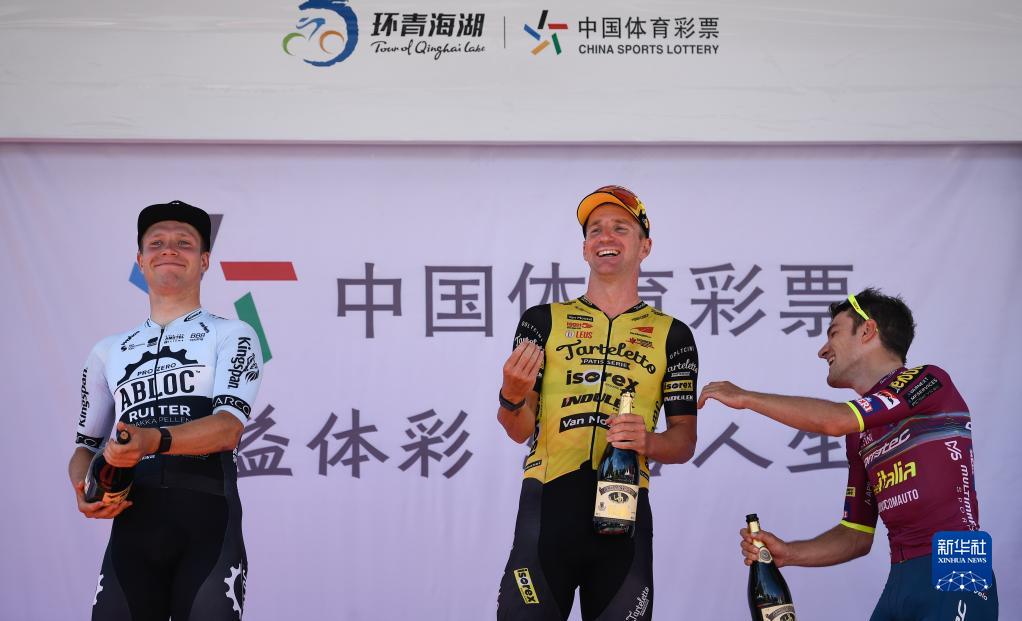 7月9日,獲得賽段前三的比利時塔特雷托-艾索雷斯車隊選手蒂莫蒂·杜邦(中)、荷蘭ABLOC CT車隊選手馬丁·普魯托(左)、意大利克羅蒂克車隊選手阿蒂利奧·維維亞尼在領獎臺上慶祝。新華社記者 張龍 攝