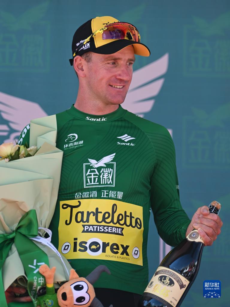 7月9日,比利時塔特雷托-艾索雷斯車隊選手蒂莫蒂·杜邦身著代表沖刺總積分第一的綠衫在領獎臺上慶祝。新華社記者 張龍 攝