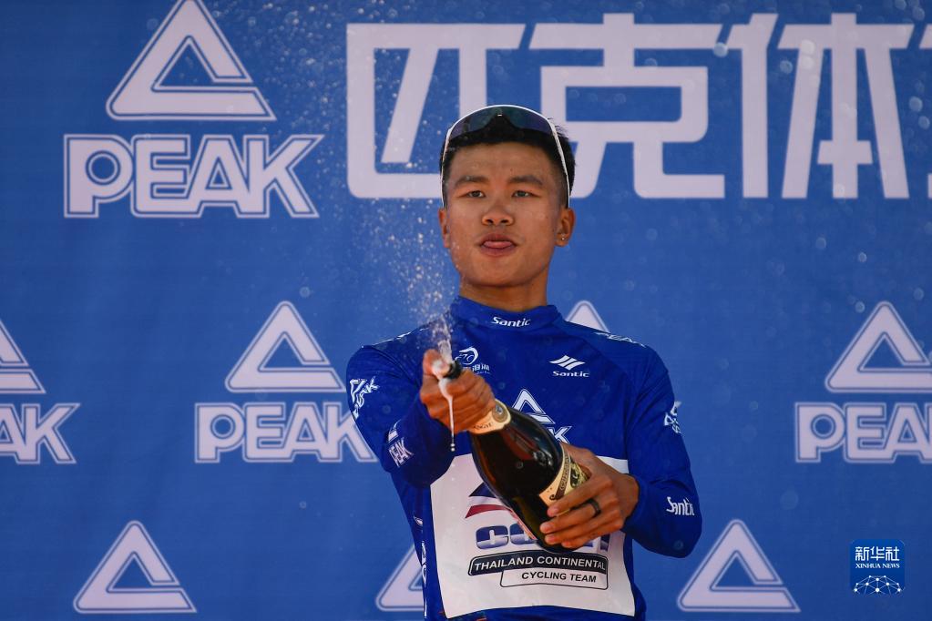7月9日,泰國國家公路自行車隊選手塔納·柴亞松巴特身著代表亞洲最佳車手的藍衫在領獎臺上噴灑香檳慶祝。新華社記者 張龍 攝