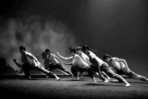作為舞蹈劇場,《凝》的呈現(xiàn)非常先鋒,給人最大的震撼是它沒有明確的劇情發(fā)展線。大幕開啟后,十幾位舞者在舞臺上站立,用一串不斷重復(fù)、節(jié)奏逐漸變化的馬步開啟演出,在前十分鐘左右的時間里,表演幾乎沒有背景音樂,間或兩聲鼓聲,抑或是梆子聲,讓舞者變化了節(jié)奏。忽然,舞者向前出拳,展現(xiàn)出快、準(zhǔn)、狠的勁道與爆發(fā)力,呼吸聲與拳風(fēng)都在耳邊。就這樣,《凝》進入了武術(shù)與舞蹈交融的世界,或呈現(xiàn)爆發(fā)力,或展現(xiàn)生動多姿的招式,或大開大合地舒展動作,將蔡李佛拳、白鶴拳、洪拳三大派別的武術(shù)招式意象化地展現(xiàn)。