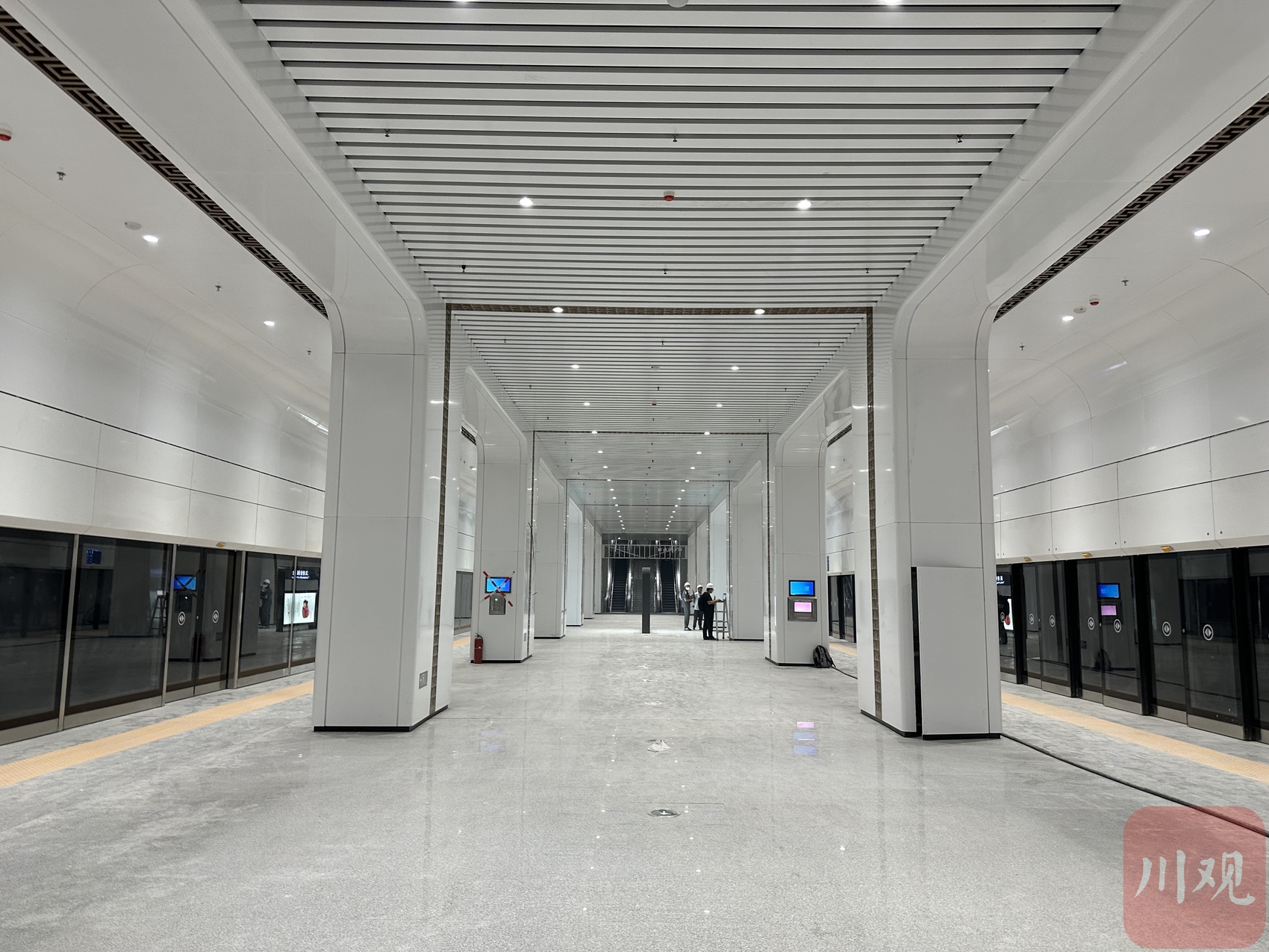 成宜高鐵天府機(jī)場(chǎng)站乘車、出站實(shí)行單循環(huán)。在施工人員的帶領(lǐng)下,記者下到地下二層的二站臺(tái)。二站臺(tái)位于4股道和6股道間,分別安裝了兩道全封閉的屏蔽門,看起來像地鐵站臺(tái)。