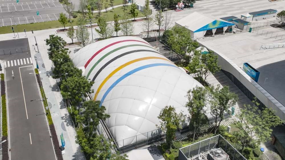 這是7月22日在成都高新體育中心多功能館外拍攝的臨時(shí)訓(xùn)練氣膜館(無(wú)人機(jī)照片)。該臨時(shí)訓(xùn)練氣膜館采用輕型裝配式氣膜結(jié)構(gòu),利用氣壓來(lái)支撐,無(wú)需任何梁、柱,可得到更大的完全凈空的建筑空間,具有節(jié)約能源、減少水資源消耗、降低二氧化碳排放量、延長(zhǎng)使用壽命、降低建筑物運(yùn)行成本、促進(jìn)可持續(xù)發(fā)展等優(yōu)點(diǎn)。新華社發(fā)